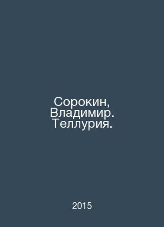 Sorokin, Vladimir. Telluria. In Russian /Sorokin, Vladimir. Telluriya. Roman. M. ASTCORPUS. 2015 year.Contact us for details or to request photos of available books. Delivery of this book could take longer than normal due to additional handling time before shipping, and no rush delivery options are available. Please let us know if you have a specific date by which you need to receive your order.SKUalbf61401864869c806