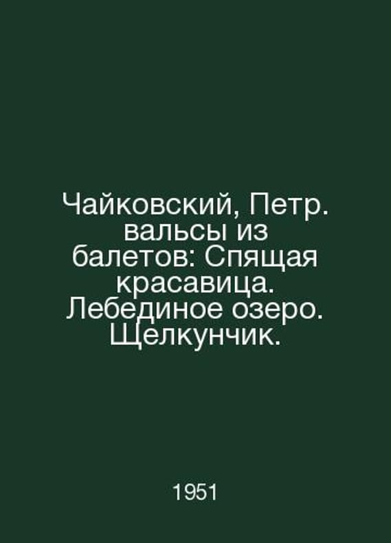 Tchaikovsky, Peter waltzes from ballets: The Sleeping Beauty. Swan Lake. The Nutcracker. In Russian /Chaykovskiy, Petr. valsy iz baletov: Spyashchaya krasavitsa. Lebedinoe ozero. Shchelkunchik. Muzguiz 1951 Light Two-Hand Piano Performation. Contact us for details or to request photos of available books. Delivery of this book could take longer than normal due to additional handling time before shipping, and no rush delivery options are available. Please let us know if you have a specific date by which you need to receive your order.SKUalbf62d1f2f604ef2a9