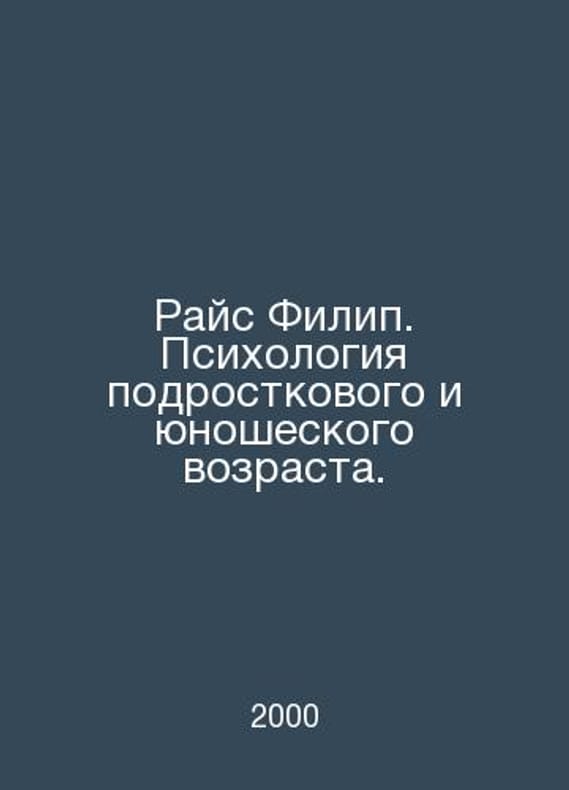 Rice Philip: Psychology of Adolescence and Adolescence. In Russian /Rays Filip. Psikhologiya podrostkovogo i yunosheskogo vozrasta. Series: Masters of Psychology. St. Petersburg. 2000 year.Contact us for details or to request photos of available books. Delivery of this book could take longer than normal due to additional handling time before shipping, and no rush delivery options are available. Please let us know if you have a specific date by which you need to receive your order.SKUalbf6738e8fe20a5db8