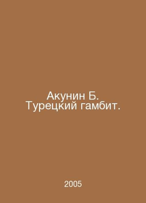 Akunin B. Turkish Gambit. In Russian /Akunin B. Turetskiy gambit. M. Zakharov 2005.Contact us for details or to request photos of available books. Delivery of this book could take longer than normal due to additional handling time before shipping, and no rush delivery options are available. Please let us know if you have a specific date by which you need to receive your order.SKUalbf75e0ffb9f7b945f