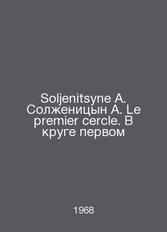 Soljenitsyne A. Solzhenitsyn A. Le premier cercle. In circle one In Russian /Soljenitsyne A. Solzhenitsyn A. Le premier cercle. V kruge pervom Traduit du anglais par Henri-Gabriel Kybarthi. Paris. Robert Laffont 1968.Contact us for details or to request photos of available books. Delivery of this book could take longer than normal due to additional handling time before shipping, and no rush delivery options are available. Please let us know if you have a specific date by which you need to receive your order.SKUalbf79abf98b7761bfd