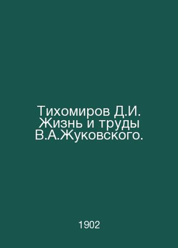 Tikhomirov D.I. The Life and Works of V.A.Zhukovsky. In Russian /Tikhomirov D.I. Zhizn i trudy V.A.Zhukovskogo. Reading for schools and the people with drawings and portraits. Childrens Reading Library. Compiled by Dm.Iv.Tikhomirov. M. Tipo-lithography by A.V.Vasilyev and K. 1902.Contact us for details or to request photos of available books. Delivery of this book could take longer than normal due to additional handling time before shipping, and no rush delivery options are available. Please let us know if you have a specific date by which you need to receive your order.SKUalbf87a9404f5a0a39c