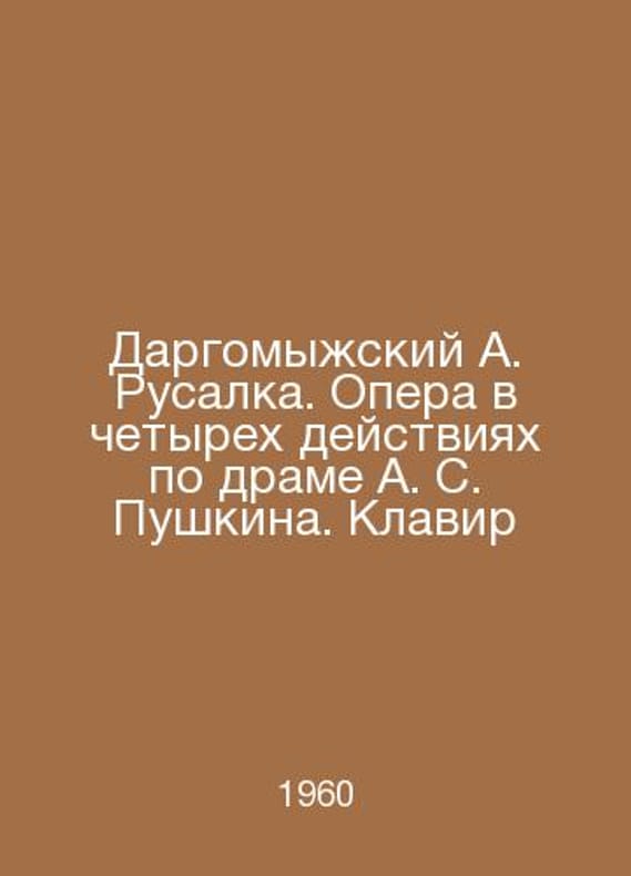 Dargomyzhsky A. Rusalka. Opera in four acts on the drama of A. S. Pushkin. Klavir In Russian /Dargomyzhskiy A. Rusalka. Opera v chetyrekh deystviyakh po drame A. S. Pushkina. Klavir This edition of the keyboard, edited in 1932 by Lamm M. Muzgiz, is based on 1960. Contact us for details or to request photos of available books. Delivery of this book could take longer than normal due to additional handling time before shipping, and no rush delivery options are available. Please let us know if you have a specific date by which you need to receive your order.SKUalbf88f2d52b54110e6