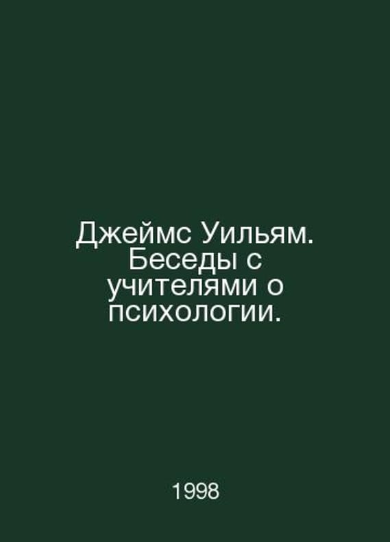 James William. Conversations with teachers about psychology. In Russian /Dzheyms Uilyam. Besedy s uchitelyami o psikhologii. Series: Classics of Psychology M. Perfection 1998.Contact us for details or to request photos of available books. Delivery of this book could take longer than normal due to additional handling time before shipping, and no rush delivery options are available. Please let us know if you have a specific date by which you need to receive your order.SKUalbf95eb367c16e9159