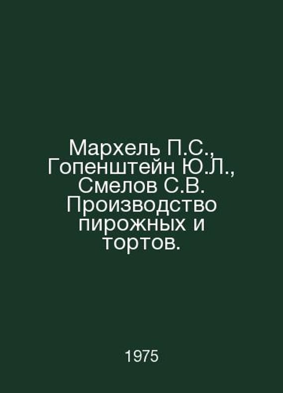 Markhel S., Gopenshtein Y.L., Smelov S.V. Production of cakes and cakes. In Russian /Markhel S., Gopenshteyn Yu.L., Smelov S.V. Proizvodstvo pirozhnykh i tortov. M. The Food Industry 1975.. Contact us for details or to request photos of available books. SKUalbfb12f3c690f43091.