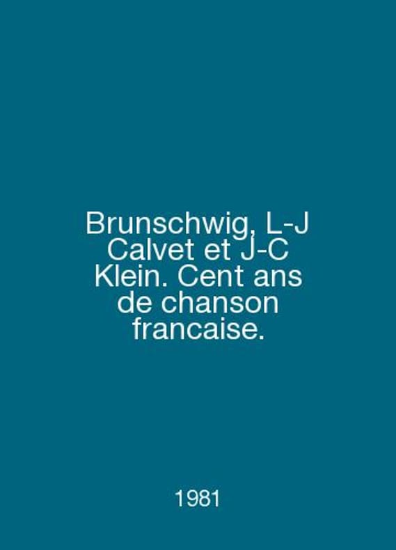 Brunschwig, L-J Calvin et J-C Klein. Cent ans de chanson francaise. In English /Brunschwig, L-J Calvet et J-C Klein. Cent ans de chanson francaise. Paris 1981. Contact us for details or to request photos of available books. Delivery of this book could take longer than normal due to additional handling time before shipping, and no rush delivery options are available. Please let us know if you have a specific date by which you need to receive your order. SKUalbfb469c8526ca6b0e