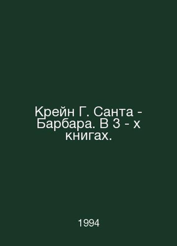 Crane G. Santa Barbara. In 3 books. In Russian /Kreyn G. Santa - Barbara. V 3 -xknigakh. Series: Hollywood Minsk BADPPR 1994. Contact us for details or to request photos of available books. Delivery of this book could take longer than normal due to additional handling time before shipping, and no rush delivery options are available. Please let us know if you have a specific date by which you need to receive your order. SKUalbfb71253f7f6e8e7a
