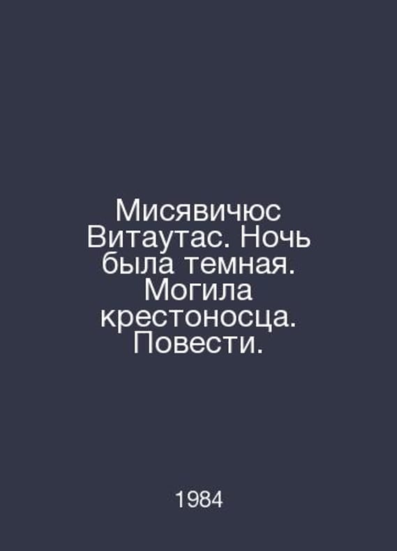 Misevichius Vytautas. The night was dark. The tomb of the Crusader. The Story. In Russian /Misyavichyus Vitautas. Noch byla temnaya. Mogila krestonostsa. Povesti. Translation from Lithuanian Vilnius 1984.Contact us for details or to request photos of available books. Delivery of this book could take longer than normal due to additional handling time before shipping, and no rush delivery options are available. Please let us know if you have a specific date by which you need to receive your order.SKUalbfb8a89eda7bbdea3
