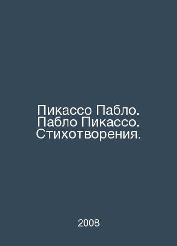 Pablo Picasso. Pablo Picasso. Poems. In Russian /Pikasso Pablo. Pablo Pikasso. Stikhotvoreniya. Series: Collection. M. Text. 2008 year.Contact us for details or to request photos of available books. Delivery of this book could take longer than normal due to additional handling time before shipping, and no rush delivery options are available. Please let us know if you have a specific date by which you need to receive your order.SKUalbfba5c947344e6de7