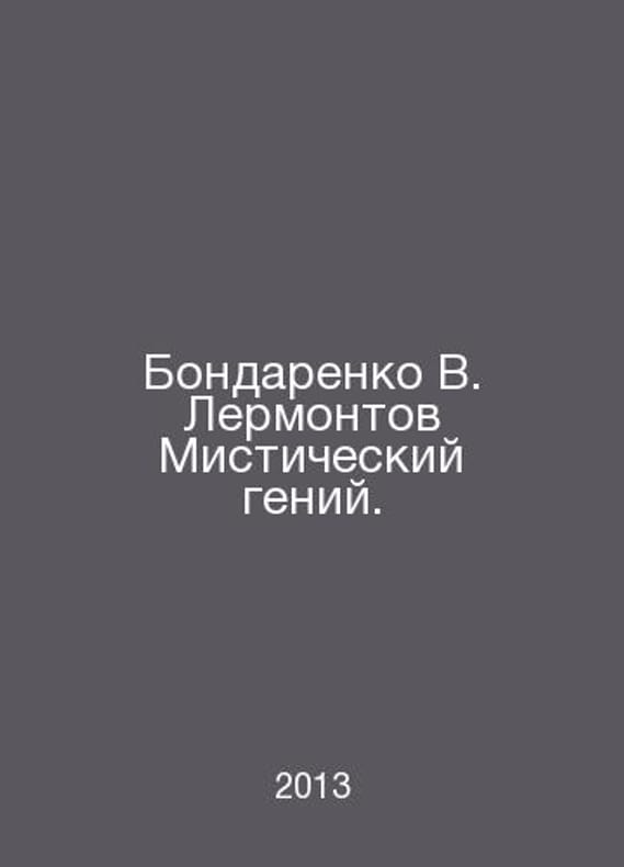 Bondarenko V. Lermontov is a mystical genius. In Russian /Bondarenko V. Lermontov Misticheskiy geniy. The series: The lives of remarkable people. Small series (LSL). M. The Young Guard. 2013.Contact us for details or to request photos of available books. Delivery of this book could take longer than normal due to additional handling time before shipping, and no rush delivery options are available. Please let us know if you have a specific date by which you need to receive your order.SKUalbfba7f266f6241dfb