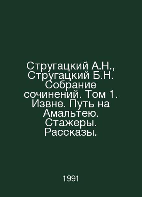 Strugatsky A.N., Strugatsky B.N. Collection of Works. Volume 1. From Outside. The Way to Amalthea. Interns. Stories. In Russian /Strugatskiy A.N., Strugatskiy B.N. Sobranie sochineniy. Tom 1. Izvne. Put na Amalteyu. Stazhery. Rasskazy. From the outside. Road to Amalthea. Trainees. Stories. M. Text 1991. Contact us for details or to request photos of available books. Delivery of this book could take longer than normal due to additional handling time before shipping, and no rush delivery options are available. Please let us know if you have a specific date by which you need to receive your order.SKUalbfe2ea4767423ecf5