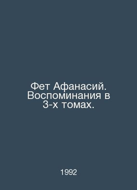 Fet Athanasius. Memories in 3 Volumes. In Russian /Fet Afanasiy. Vospominaniya v 3-kh tomakh. M. Culture 1992.Contact us for details or to request photos of available books. Delivery of this book could take longer than normal due to additional handling time before shipping, and no rush delivery options are available. Please let us know if you have a specific date by which you need to receive your order.SKUalbff628abee3474400