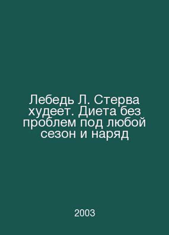 L. Stervas Swan Weighs Weight: A No Problem Diet for Any Season or Clothes In Russian /Lebed L. Sterva khudeet. Dieta bez problem pod lyuboy sezon i naryad Rostov Phoenix 2003. Contact us for details or to request photos of available books. Delivery of this book could take longer than normal due to additional handling time before shipping, and no rush delivery options are available. Please let us know if you have a specific date by which you need to receive your order.SKUalbff79543b348fbbf1