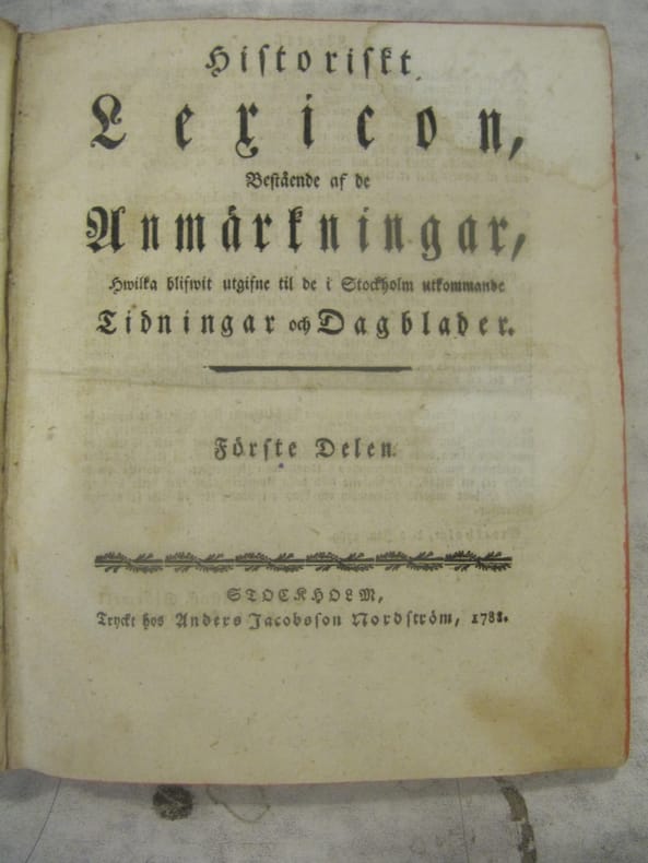 Historiskt lexicon, bestaende af de anmarkningar, hwilka blifwit utgifne til de I Stockholm utkommande tidningar och dagblader, Stockholm, 1788, 1789, In Swedish. The price of $99 is for a single issue. Several issues are available during the period indicated in the listing title. Please inquire about availability of specific issues. Id3-008776