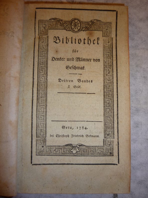 Bibliothek fur Denker und Manner von GesÒhmak, Gera, In German, 1784, 1785, 1786. The listing price of $299 is for a single issue of the periodical. Several issues are available during the period indicated in the listing title. Please inquire about availability of specific issues, id3-008846