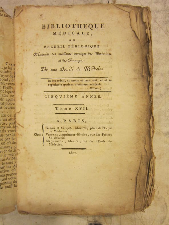 Bibliotheque medicale, Paris, 1807, In French. The listing price of $299 is for a single issue of the periodical. Several issues are available during the period indicated in the listing title. Please inquire about availability of specific issues, id3-008849