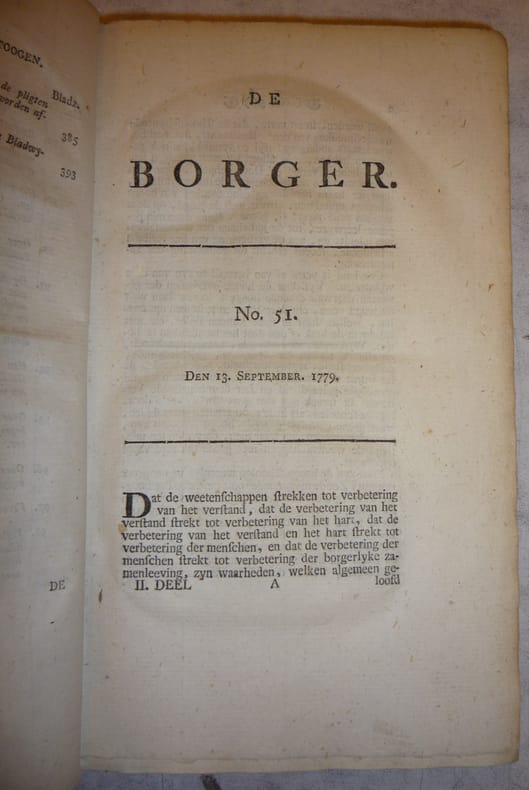 De Borger, publisher: J. van Schoonhoven, Utrecht, 1779, 1780, In German. The listing price of $99 is for a single issue of the periodical. Several issues are available during the period indicated in the listing title. Please inquire about availability of specific issues, id3-008906
