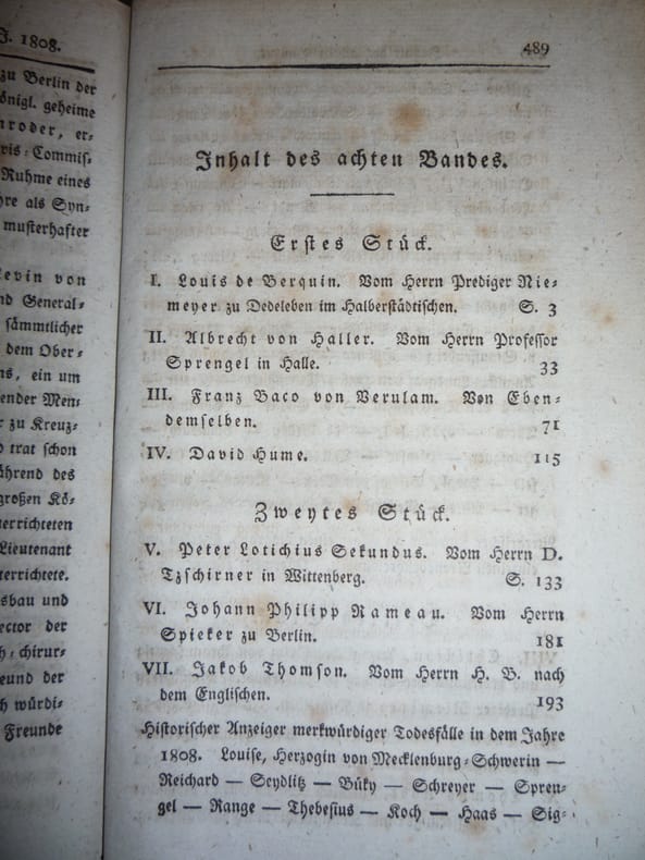 Der Biograph, Darstellungen merkwurdiger Menschn der drey letzten Jahrhunderte. Berlin, 1809, In German. The listing price of $99 is for a single issue of the periodical. Several issues are available during the period indicated in the listing title. Please inquire about availability of specific issues, id3-008918