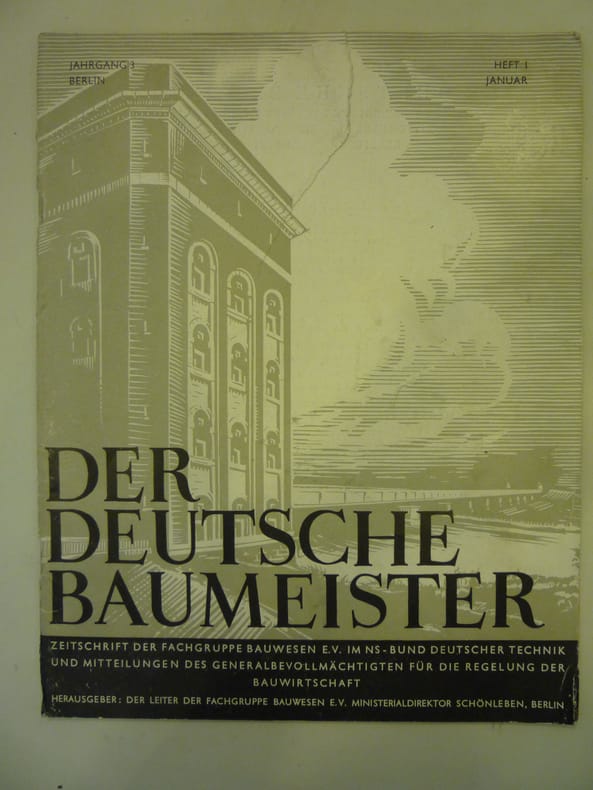 Der Deutsche Baumeister, publisher: Herausgeber: Der leiter der fachgruppe bauweisen E.V. Ministerialdirektor schonleben, Berlin, In German, 1941, 1942. The listing price of $99 is for a single issue of the periodical. Several issues are available during the period indicated in the listing title. Please inquire about availability of specific issues, id3-008922