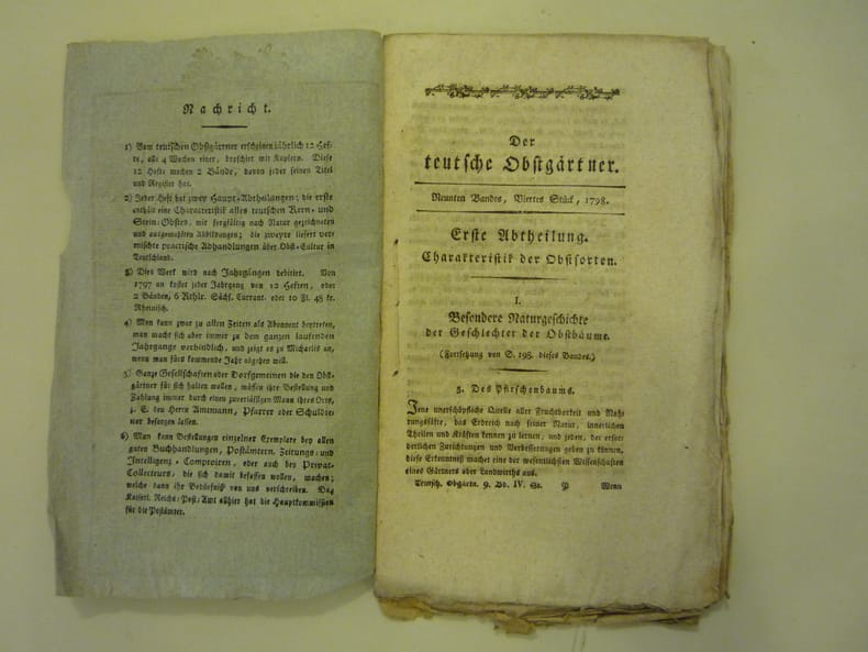 Der teutsche Obstgartner, oder gemeinnutziger Magazin des Obstbaues in Teutschlands sammtlichen Kreisen, publisher: J.V.Sickle, Weimar, In German, 1796, 1797, 1798, 1799. The listing price of $99 is for a single issue of the periodical. Several issues are available during the period indicated in the listing title. Please inquire about availability of specific issues, id3-008940