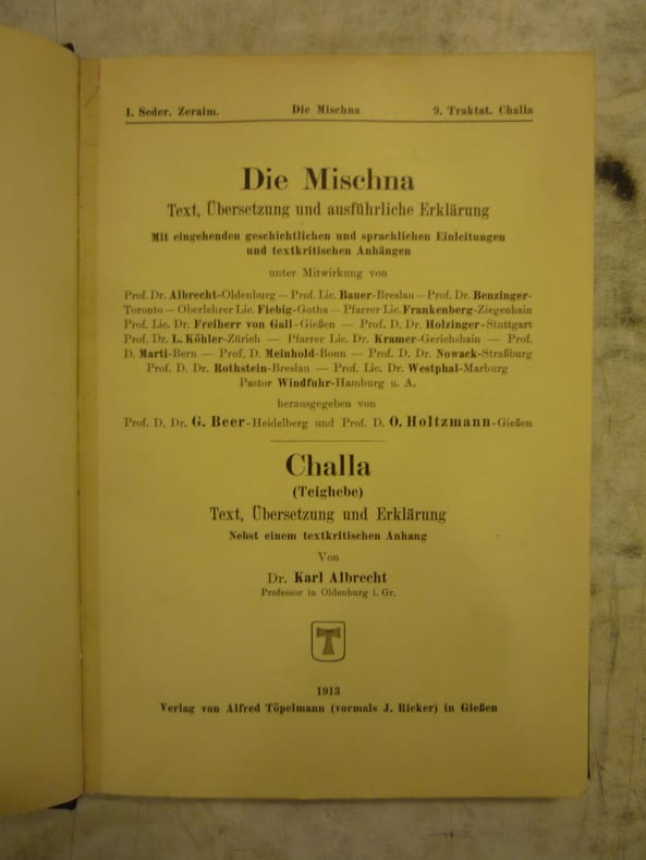 Die Mischna, publisher: Alfred Topelmann, Gieben, In German, 1912, 1913, 1916, 1922, 1924, 1926, 1929. The listing price of $99 is for a single issue of the periodical. Several issues are available during the period indicated in the listing title. Please inquire about availability of specific issues, id3-008969