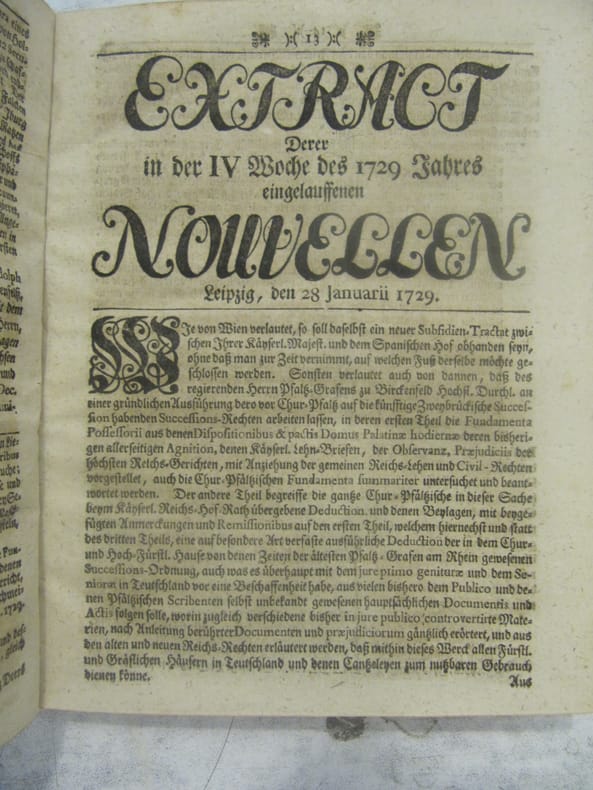 Extract derer Nouvellen, Leipzig, 1729, In German. The listing price of $99 is for a single issue of the periodical. Several issues are available during the period indicated in the listing title. Please inquire about availability of specific issues, id3-008993