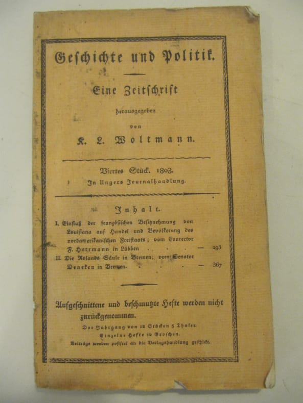 Geschichte und Politik, Berlin, In German, 1800, 1801, 1803. The listing price of $299 is for a single issue of the periodical. Several issues are available during the period indicated in the listing title. Please inquire about availability of specific issues, id3-009018