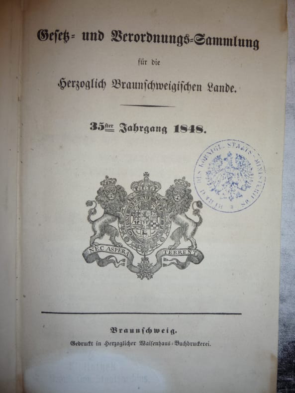 Gesetz, und verordnungs,sammlung fur die herzoglich Braunschweigischen Lande, publisher: Gedruckt in Herzoglicher Waisenhaus Buchdruckerei, Braunschweig, 1848, In German. The listing price of $99 is for a single issue of the periodical. Several issues are available during the period indicated in the listing title. Please inquire about availability of specific issues, id3-009020