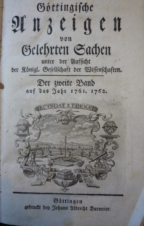 Gottingische Anzeigen von Gelehrten Sachen, Gottingen, 1762, In German. The listing price of $99 is for a single issue of the periodical. Several issues are available during the period indicated in the listing title. Please inquire about availability of specific issues, id3-009024