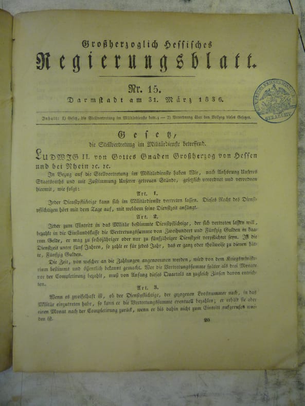 Groszherzoglich Hessisches Regierungsblatt, Darmstadt, 1836, In German. The listing price of $99 is for a single issue of the periodical. Several issues are available during the period indicated in the listing title. Please inquire about availability of specific issues, id3-009026