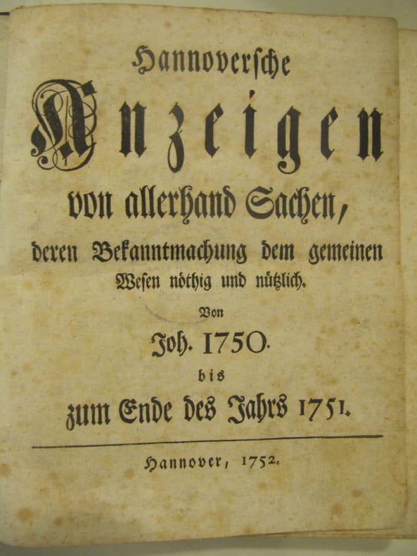 Hannoversche Anzeigen von allerhand Sachen, deren Bekanntmachung dem gemeinen Wesen nothig und nurlich, Hanover, In German, 1715, 1750, 1751. The listing price of $99 is for a single issue of the periodical. Several issues are available during the period indicated in the listing title. Please inquire about availability of specific issues, id3-009029