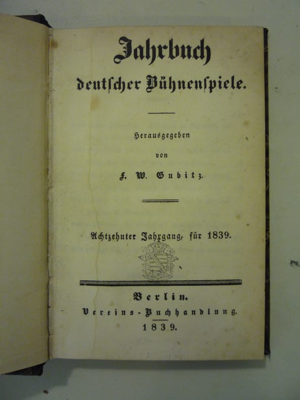 Jahrbuch deutscher Buhnenspiele, Berlin, In German, 1825, 1832, 1833, 1834, 1835, 1837, 1838, 1839, 1842, 1850, 1851, 1858. The listing price of $99 is for a single issue of the periodical. Several issues are available during the period indicated in the listing title. Please inquire about availability of specific issues, id3-009053