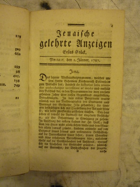 Jenaische gelehrte Anzeigen, Jena, 1787, In German. The listing price of $99 is for a single issue of the periodical. Several issues are available during the period indicated in the listing title. Please inquire about availability of specific issues, id3-009057