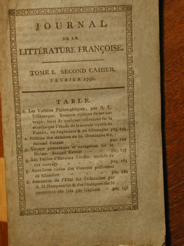 Journal de la Litterature Francoise, Berlin, In French, 1796, 1797. The listing price of $299 is for a single issue of the periodical. Several issues are available during the period indicated in the listing title. Please inquire about availability of specific issues, id3-009063