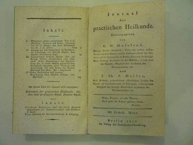 Journal der practischen Arzneykunde und Wundarzneykunst. Journal der practischen Heilkunde, Berlin, 1800, 1810, 1817, 1829, In German. The listing price of $99 is for a single issue of the periodical. Several issues are available during the period indicated in the listing title. Please inquire about availability of specific issues, id3-009065