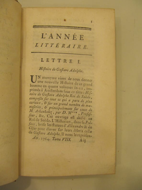 L annee Litteraire, publisher: Chez Lacombe, Libraire Quai de Conti, Paris/ Amsterdam, In French, 1756, 1764, 1765, 1766, 1768, 1770, 1771, 1774, 1775, 1776, 1777, 1778, 1780, 1781, 1782, 1783, 1784, 1785, 1786, 1787, 1789, 1793. The listing price of $299 is for a single issue of the periodical. Several issues are available during the period indicated in the listing title. Please inquire about availability of specific issues, id3-009102