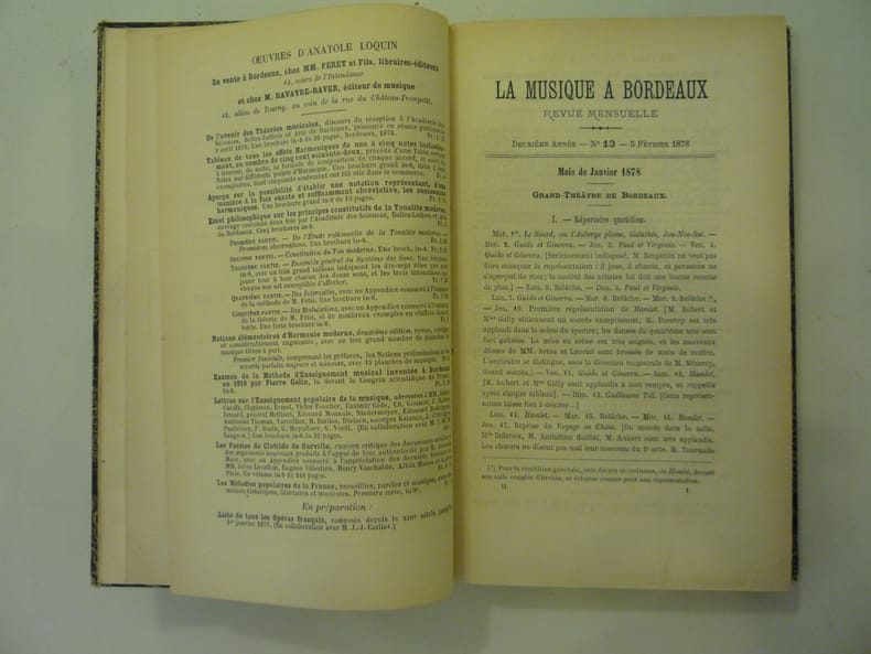 Très rare exemplaire de l'édition originale de la première année de cette revue musicale, publiée par Anatole Loquin en 1878. Voir également dans notre catalogue la Seconde Année (1878). Seules ces deux premières années furent publiées. Etat très satisfaisant (reliure lég. frottées, deux pl. débrochées, bon état par ailleurs). Diffusée à petit nombre, elle est aujourd'hui de la plus grande rareté. On y trouve, mêlés, à la fois d'importants articles de critique musicale, des comptes-rendus et des essais théoriques de qualité que tout le détail de la vie musicale bordelaise du temps.