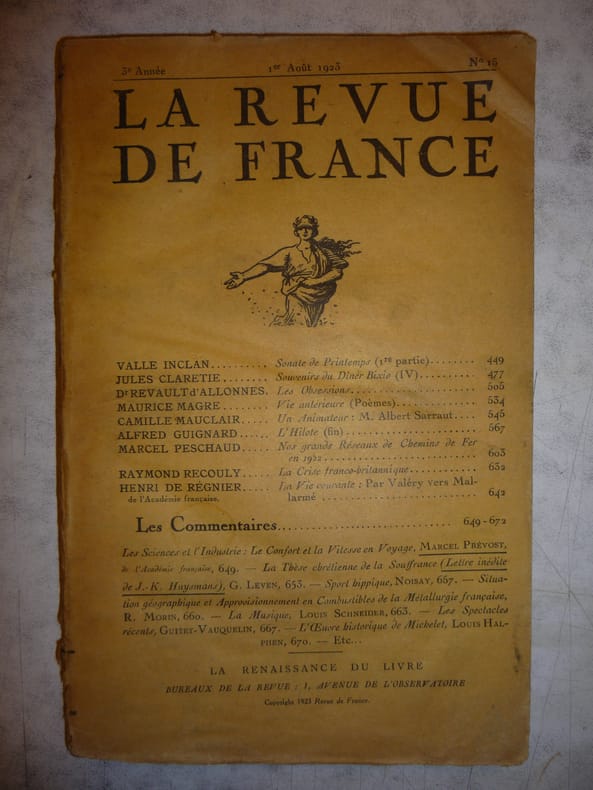 La Revue de France, Paris, In French, 1923, 1928, 1929. The listing price of $299 is for a single issue of the periodical. Several issues are available during the period indicated in the listing title. Please inquire about availability of specific issues, id3-009126