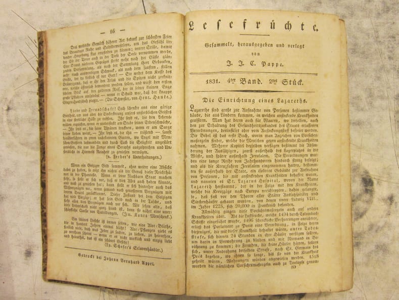 Lesefruchte vom felde der neuesten literatur des in, und auslandes. J.J.C.Pappe, publisher: J.J.C.Pappe, Hamburg, 1831, In German. The listing price of $299 is for a single issue of the periodical. Several issues are available during the period indicated in the listing title. Please inquire about availability of specific issues, id3-009167
