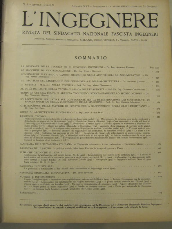 L ingegnere, Milan, 1942, In Italian. The listing price of $99 is for a single issue of the periodical. Several issues are available during the period indicated in the listing title. Please inquire about availability of specific issues, id3-009172
