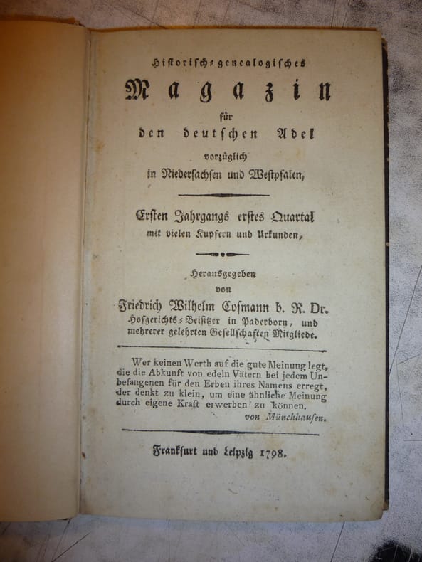 Historisch Genealogisches Magazin fur den deutschen Adel, Frankfurt und Leipzig, 1798, In German. The listing price of $299 is for a single issue of the periodical. Several issues are available during the period indicated in the listing title. Please inquire about availability of specific issues, id3-009190