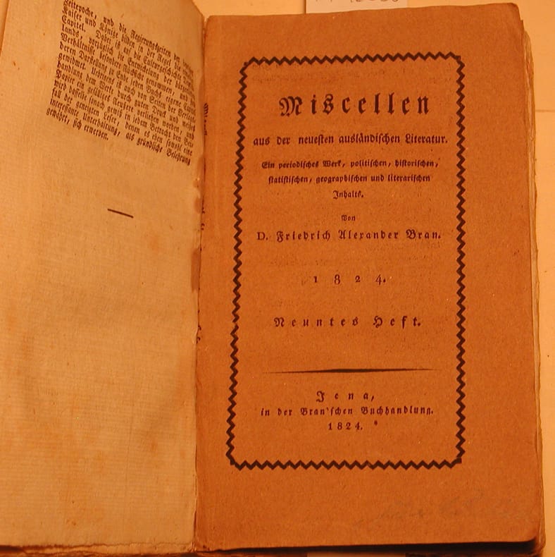 Miscellen. Aus der neuesten auslandischen Literatur, Jena, 1824, In German. The listing price of $299 is for a single issue of the periodical. Several issues are available during the period indicated in the listing title. Please inquire about availability of specific issues, id3-009210