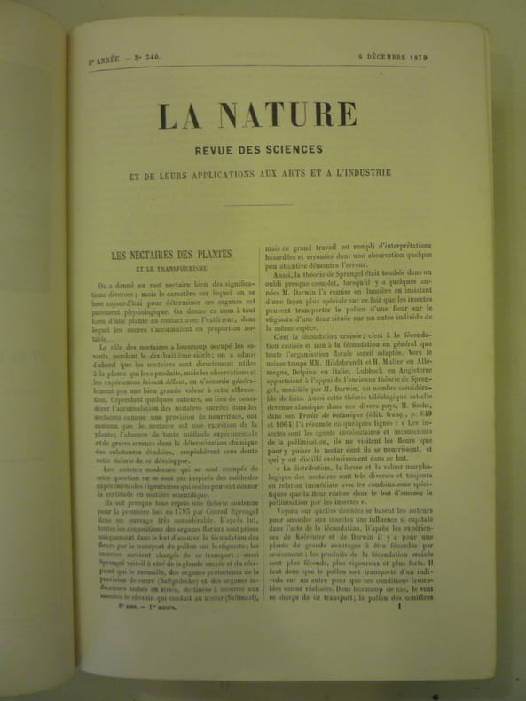 La Nature revue des sciences, publisher: Masson Et Cie, Editeurs Libraires De l academie de medecine, Paris, In French, 1873, 1874, 1879, 1880, 1881, 1882, 1883, 1898, 1899, 1902, 1903, 1905, 1907, 1908, 1912, 1914, 1915, 1916, 1917, 1918, 1929. The listing price of $99 is for a single issue of the periodical. Several issues are available during the period indicated in the listing title. Please inquire about availability of specific issues, id3-009498
