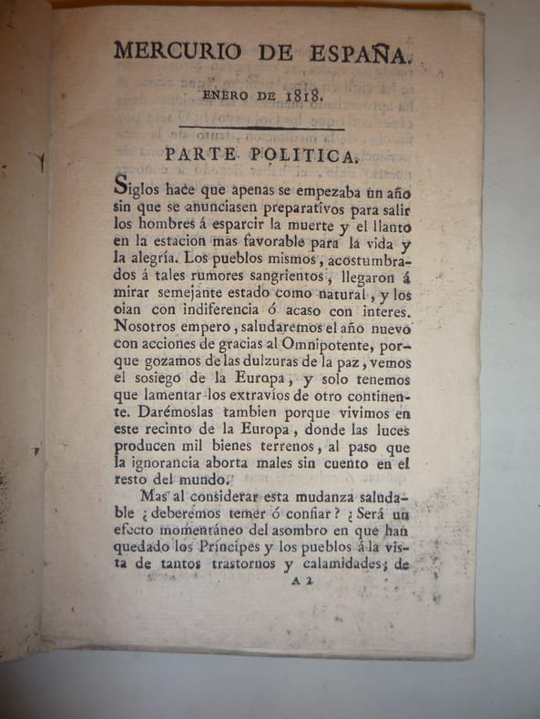 Mercurio de Espana, publisher: Imprenta Real, Madrid, 1818, In Spanish. The listing price of $199 is for a single issue of the periodical. Several issues are available during the period indicated in the listing title. Please inquire about availability of specific issues, id3-009505