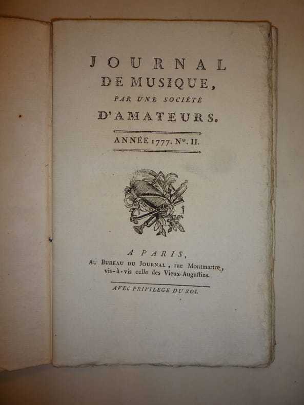 Journal de Musique, par une societe D amateurs, Paris, In French, 1773, 1777. The listing price of $199 is for a single issue of the periodical. Several issues are available during the period indicated in the listing title. Please inquire about availability of specific issues, id3-009507