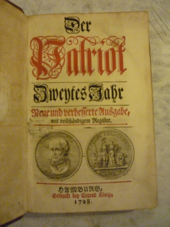 Der Patriot, publisher: Conrad Ronig, Hamburg, In German, 1724, 1726. The listing price of $99 is for a single issue of the periodical. Several issues are available during the period indicated in the listing title. Please inquire about availability of specific issues, id3-009599