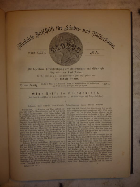 Globus. Illustrierte zeitschrift fur Lander und Volkerkunde, Braunschweig, 1879, In German. The listing price of $99 is for a single issue of the periodical. Several issues are available during the period indicated in the listing title. Please inquire about availability of specific issues, id3-009609