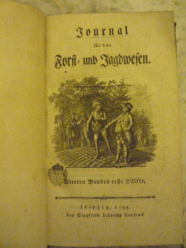 Journal fur das Forst und Jagdwesen, publisher: Giegfried Lebrecht Grufius, Leipzig, In German, 1794, 1796. The listing price of $299 is for a single issue of the periodical. Several issues are available during the period indicated in the listing title. Please inquire about availability of specific issues, id3-009681