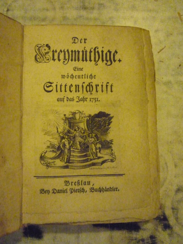 Der Vregmuthige gine mochentliche Gittenschrift, publisher: Ben Daniel Vietsch, Buchhandler, Breslau, 1751, In German. The listing price of $99 is for a single issue of the periodical. Several issues are available during the period indicated in the listing title. Please inquire about availability of specific issues, id3-009685