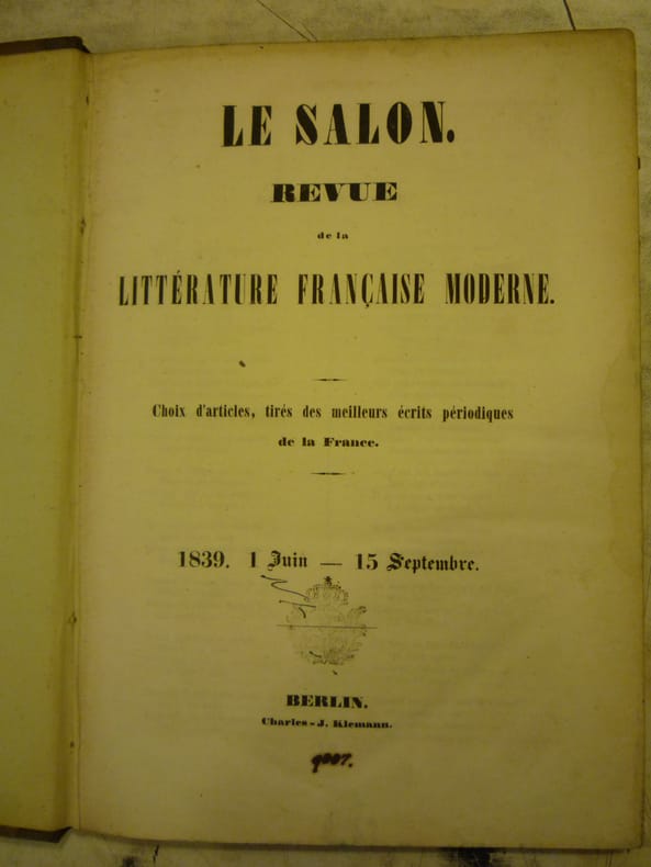 Le Salon. Revue de la Litterature Francaise Moderne, publisher: Charles, J.Klemann, Berlin, 1839, In French. The listing price of $99 is for a single issue of the periodical. Several issues are available during the period indicated in the listing title. Please inquire about availability of specific issues, id3-009686